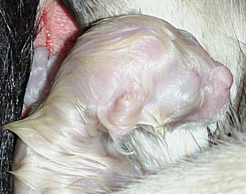 dann beide Augen geöffnet. Gleichzeitig entfalten sich langsam die Ohren und die Pig- mentierung beginnt. Zuerst verfärben sich Ohrränder und Nasenspiegel. Es folgen Fußballen und Schwanz.