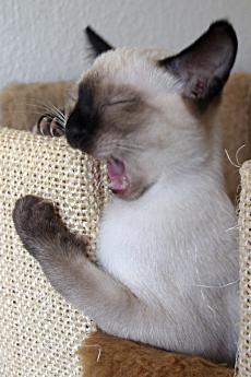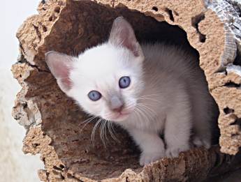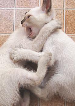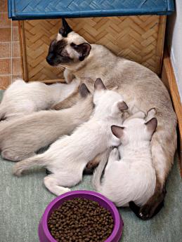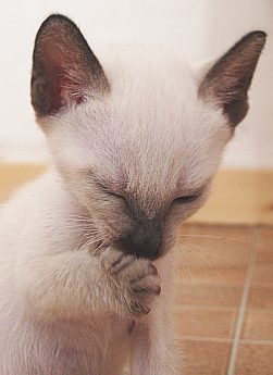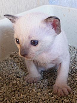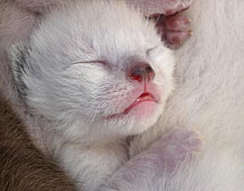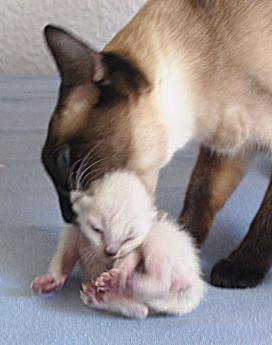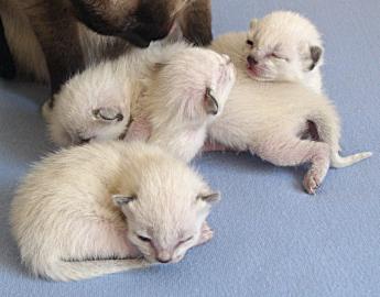 Siambabies werden zahnlos, blind und taub geboren. Wie man an dem obigen Käterchen sehr schön sehen kann, sind die Babies zunächst schneeweiß und ihre Nasenspiegel und Fußballen sind